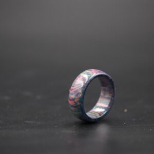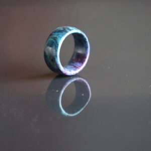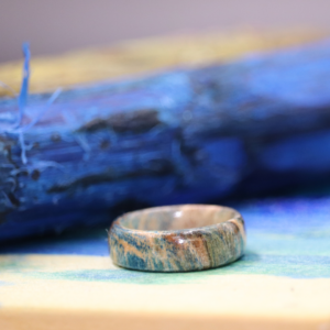 地元お茶の木を利用して作製した指輪。昨今の時流から、お茶の葉を急須にいれて日本茶をたしなむという楽しみ方も薄れて参りました。天然木に色を浸透させる技術の究明先にお茶の木を試したところ、驚きの連続。もともとお茶の木を旋盤で削っていくと、色白の美人さんです。そうして色を浸透させて削り磨きあげた先に、見事なグラデーションを描いてくれました。オイルを浸透させたすぐのつややかな見栄えは、まるでシルクのような柔らかさを感じさせるような木質模様となります。そのままの状態を本来商品としてお出ししたいのですが、技術が追いつきません。上記写真は、少し色味が濃い過ぎ